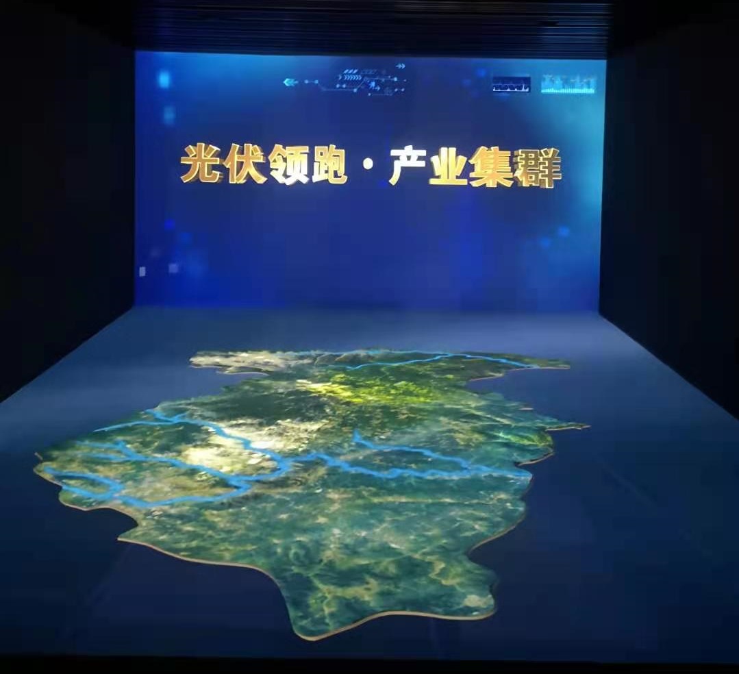 該區(qū)域為12臺投影機投射出的L型裸眼3D沙盤,展出了,鐵路和公路交通圖,礦產區(qū)域分布情況;以及“光伏領跑 綠色發(fā)展”主題影片,一同感受陽泉光伏領跑者示范基地一路走來的光輝歷程。