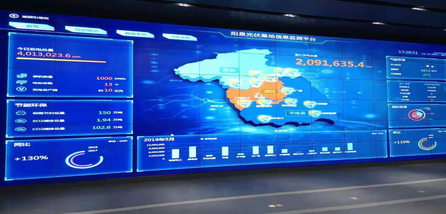 信息平臺匯集了光伏領跑者項目十三家投資商的實時發(fā)電數據、地理位置、具體信息。整個項目裝機容量為1000MW(兆瓦),年發(fā)電總產值約10億元。以及在建和列入開發(fā)方案的共計48萬千瓦風電項目。為拓寬平臺的服務領域,實現平臺的綜合化利用,該平臺除實現對光伏基地整體運行情況的實時監(jiān)測外,還可以通過可視會議系統(tǒng),實時連線重點工程情況。